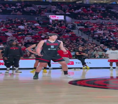 开拓者球迷嘉年华新秀杨瀚森和乐福背着书包学跳舞队友鼓掌